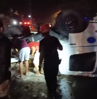 Kondisi kabin truk kontainer yang terbalik usai menghantam dua sepeda motor di simpang tiga Gamol, JLS Salatiga, Rabu malam (1/10/2025). Petugas bersama warga tampak berada di lokasi kejadian untuk membantu proses evakuasi.(..)
