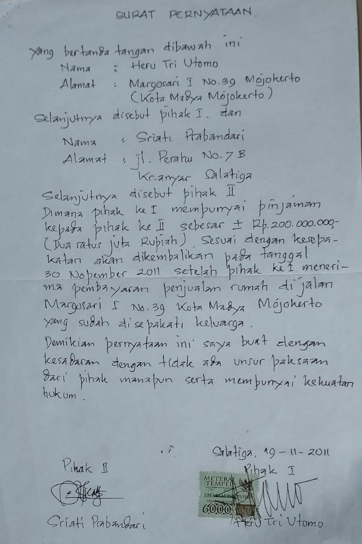 Berdasarkan dokumen dan keterangan yang dihimpun, awal permasalahan bermula dari pinjaman sebesar Rp200 juta yang telah disepakati kedua belah pihak melalui surat pernyataan bermaterai. Namun, seiring berjalannya waktu, kewajiban tersebut tak kunjung dipenuhi.