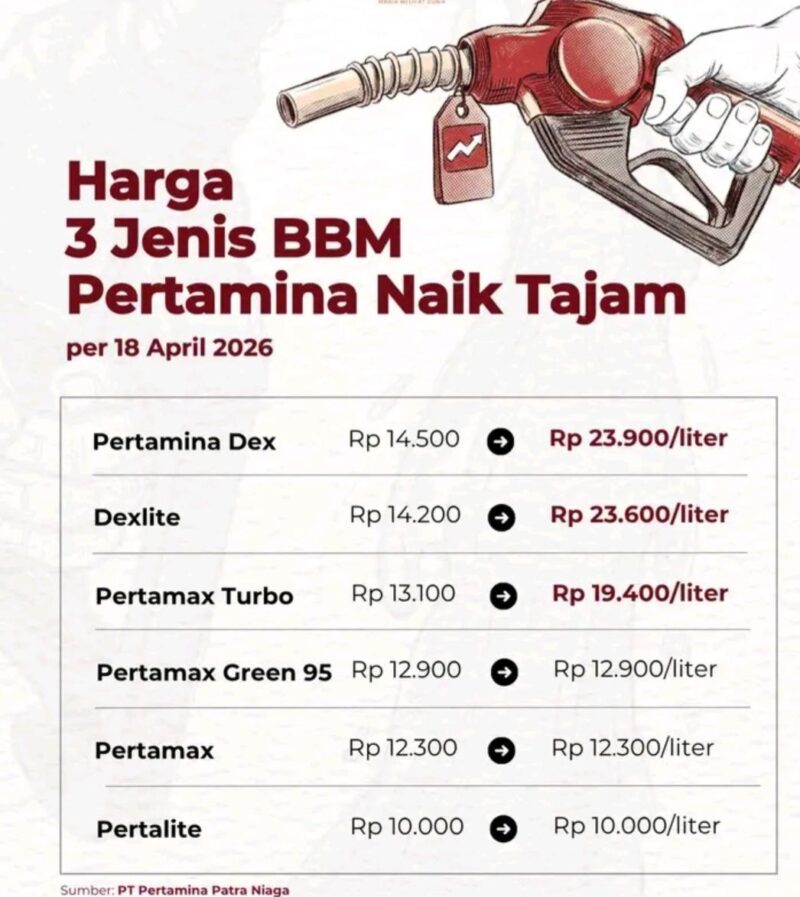 JAKARTA|JEJAKKASUSINDONESIANEWS.COM – Kenaikan harga bahan bakar minyak (BBM) kembali terjadi. PT Pertamina (Persero) melalui unit usahanya PT Pertamina Patra Niaga resmi menyesuaikan harga sejumlah produk BBM non-subsidi mulai 18 April 2026.