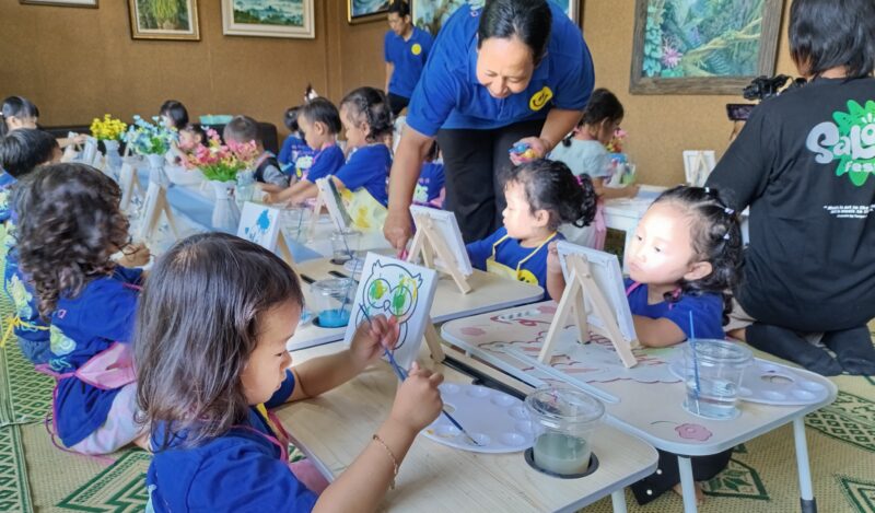 Menjelang siang, deretan kanvas warna-warni hasil karya anak-anak dipajang di meja panjang. Setiap goresan tampak bebas dan berani — cerminan dari imajinasi besar di balik kuas kecil yang mereka genggam.(..)