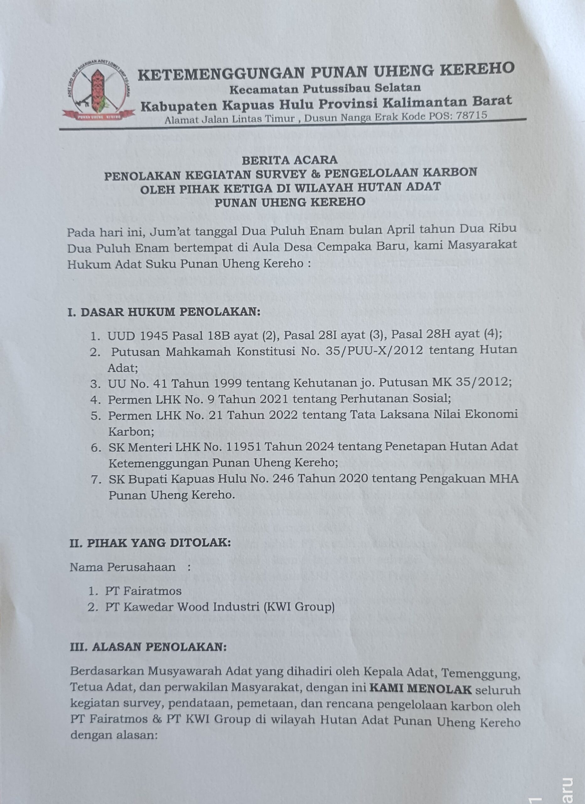 Kapuas Hulu | Jejakkasusindonesianews.com – Masyarakat Adat Punan Uheng Kereho secara tegas menolak rencana Konsesi Perizinan Berusaha Pemanfaatan Hutan – Restorasi Ekosistem (PBPH-RE) oleh PT Kawedar Wood Industry (KWI) di wilayah adat mereka, Kecamatan Putussibau Selatan, Kabupaten Kapuas Hulu, Kalimantan Barat.