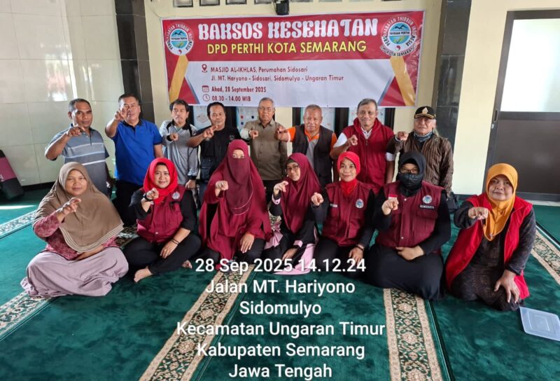 Ungaran|jejakkasusindonesianews.com – Ratusan warga tampak antusias mengikuti kegiatan Bakti Sosial (Baksos) Kesehatan yang digelar DPD PERTHI Kota Semarang di Masjid Al-Ikhlas, Perumahan Sidosari, Jl. MT. Hariyono, Sidomulyo, Kecamatan Ungaran Timur, Kabupaten Semarang, pada Ahad (28/9/2025).
