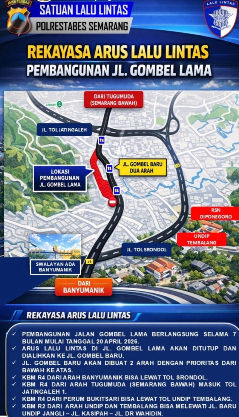Semarang |Jejakkasusindonesianews.com– Penutupan sementara Jalan Gombel Lama resmi diberlakukan mulai Senin, 20 April 2026, guna mendukung proyek perbaikan infrastruktur jalan yang diperkirakan berlangsung selama tujuh bulan.