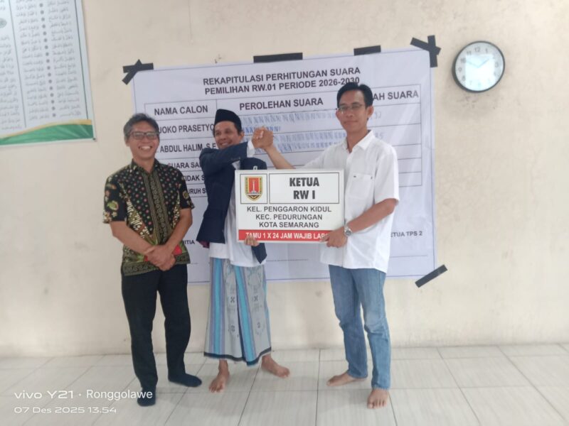 Semarang|Jejakkasusindonesianews.com- Pesta demokrasi di tingkat Rukun Warga (RW) 01 Kelurahan Penggaron Kidul, Kecamatan Pedurungan, Kota Semarang berlangsung kondusif pada Minggu (7/12/2025). Pemilihan yang menghadirkan dua kandidat ini digelar di dua tempat pemungutan suara (TPS).