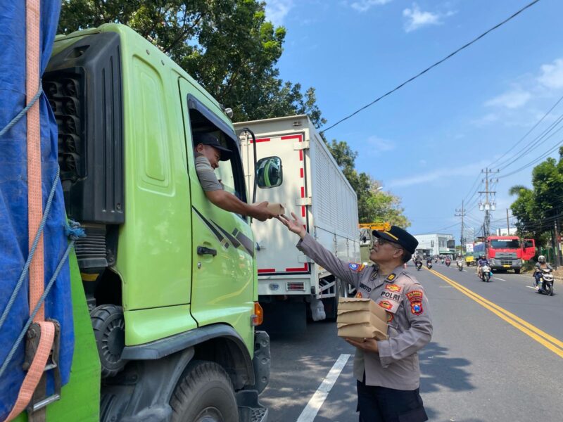 Polisi Peduli : Polresta Banyuwangi Berbagi Nasi Kotak untuk Sopir Truk di Jalur Pelabuhan Ketapang