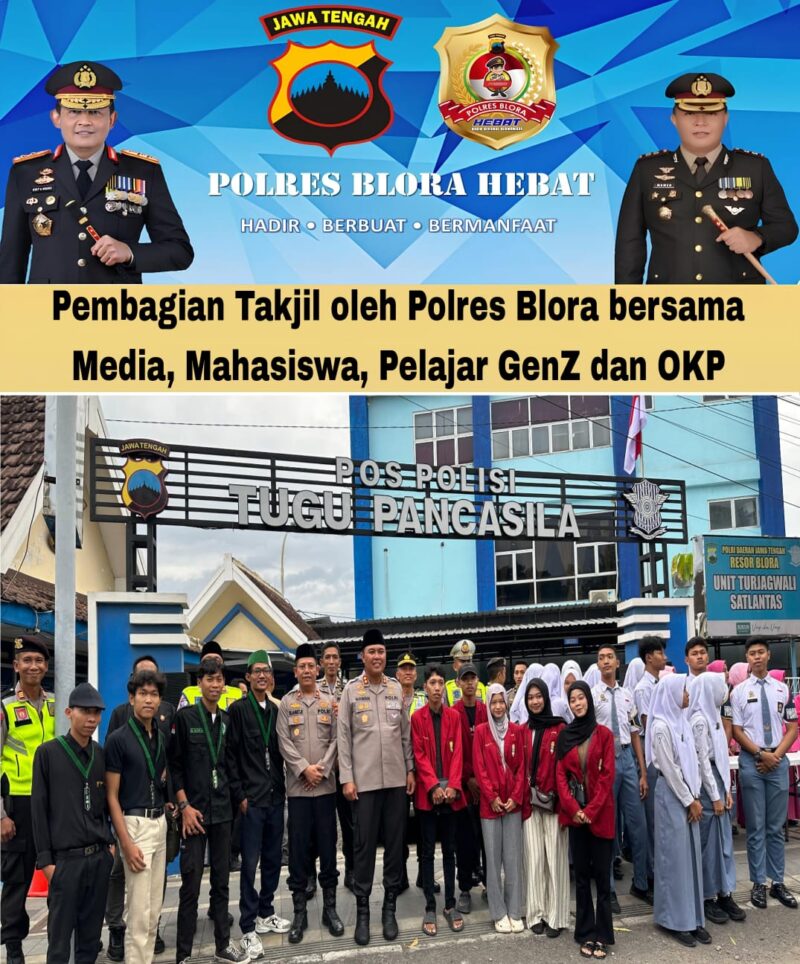 BLORA |Jejakkasusindonesianews.com – Semangat berbagi di bulan Ramadan ditunjukkan jajaran Polres Blora dengan menggandeng mahasiswa, pelajar Generasi Z (Gen Z), Organisasi Kemasyarakatan Pemuda (OKP), serta awak media dalam aksi sosial di kawasan Pos Polisi Tugu Pancasila, Kamis (26/2/2026) sore.