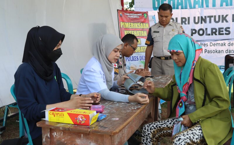 Kegiatan berlanjut dengan pengobatan gratis oleh tim Seksi Kedokteran dan Kesehatan (Sidokkes) Polres Demak. Warga tampak antusias memeriksakan kesehatan, mulai dari lansia hingga anak-anak. Layanan medis ini menjadi bukti bahwa Polri hadir menyentuh langsung kebutuhan masyarakat – dari pangan hingga kesehatan.
